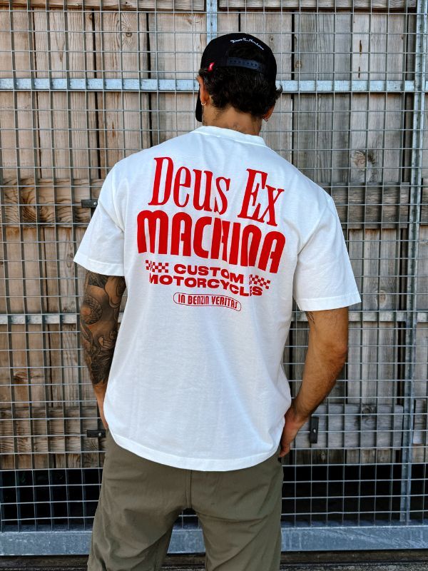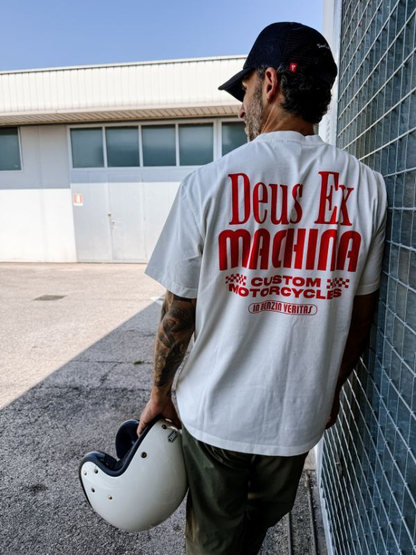 Sotto, la T-shirt loose di Deus con grafica rossa a contrasto: un dettaglio semplice ma d’effetto, che aggiunge un tocco di colore e rende l’outfit più dinamico e personale.