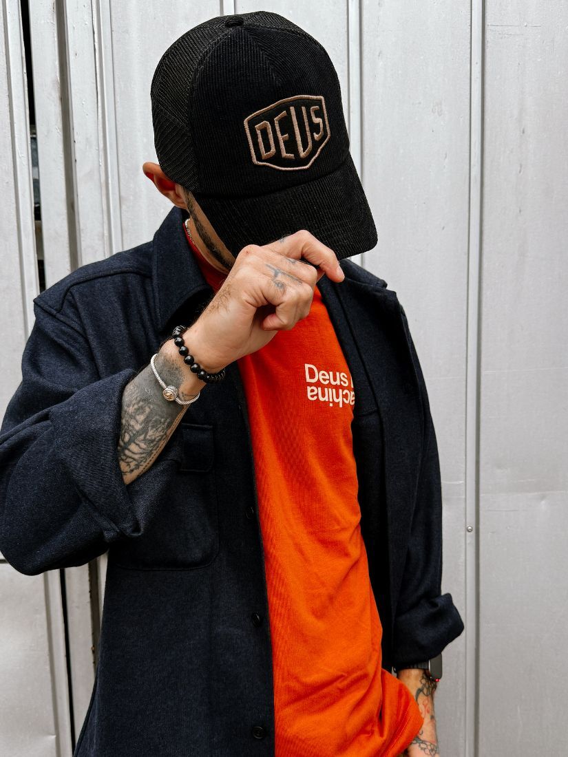 A completare il layering, l’overshirt Deus: morbida, elasticizzata, con quell’allure heritage che incontra perfettamente l’anima relaxed del workwear. Una giacca camicia che si porta con disinvoltura e che aggiunge profondità al look.