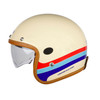 Costruito per la leggerezza e la resistenza il Mora, vanta una calotta ultra-leggera in fibra di carbonio, che garantisce un peso di soli 900 +/-50g, assicurando un comfort ineguagliabile anche nei tragitti più lunghi. La sua finitura in beige lucido è accentuata da bande orizzontali rosse, azzurre e blu che ne avvolgono la parte inferiore, richiamando lo spirito racing e un design retrò inconfondibile.