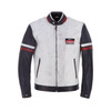 Caratterizzata da un'accattivante combinazione di colori, con un corpo principale in pelle in vintage white e maniche a contrasto in pelle blu, la V-Series cattura immediatamente l'attenzione. Le iconiche bande orizzontali rosse e bianche sulle braccia richiamano direttamente il mondo delle gare, evocando un senso di dinamismo e heritage.
