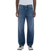 Un classico rivisitato in chiave sostenibile. Questi jeans straight fit offrono una vestibilità dritta e morbida, con vita regolare e linea fluida dai fianchi all’orlo. Realizzati in denim indaco di cotone riciclato da 12 oz con certificazione GRS, sono sottoposti a un lavaggio stone wash medio che dona un autentico effetto vintage, arricchito da baffi e usure nelle zone strategiche.